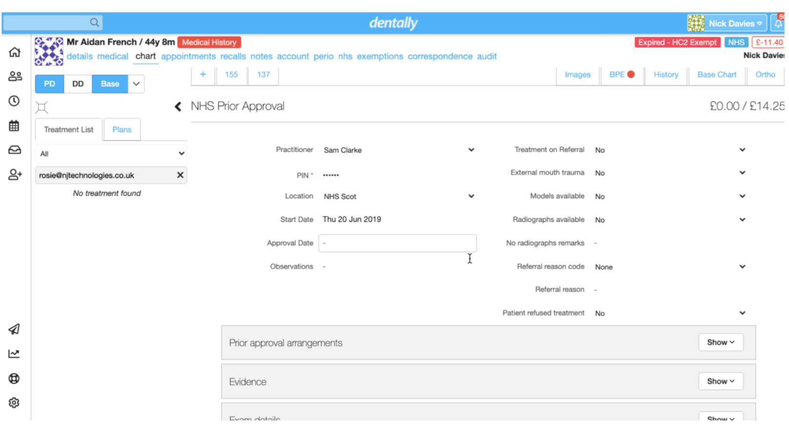 When a prior approval is sent off, the PSD will send a link for the user to upload any supporting evidence that has been requested. The submission of digital photographs and radiographs in support of a case can be run from Dentally. We have designed the link to work in a way that allows dentists to manage the process in a simplified way. In essence we do not force the practitioner to submit a prior approval, as we know that some treatment items do not qualify to be counted towards the final approval amount. Therefore, given that calculating the treatment amount can be complex and the regulations that mandates prior approvals can sometimes be ambiguous, we opted to warn the user that the total was getting within £25 of the limit or needs a prior approval. This means practitioners decide for themselves what they need to do based on their own knowledge and experience.
