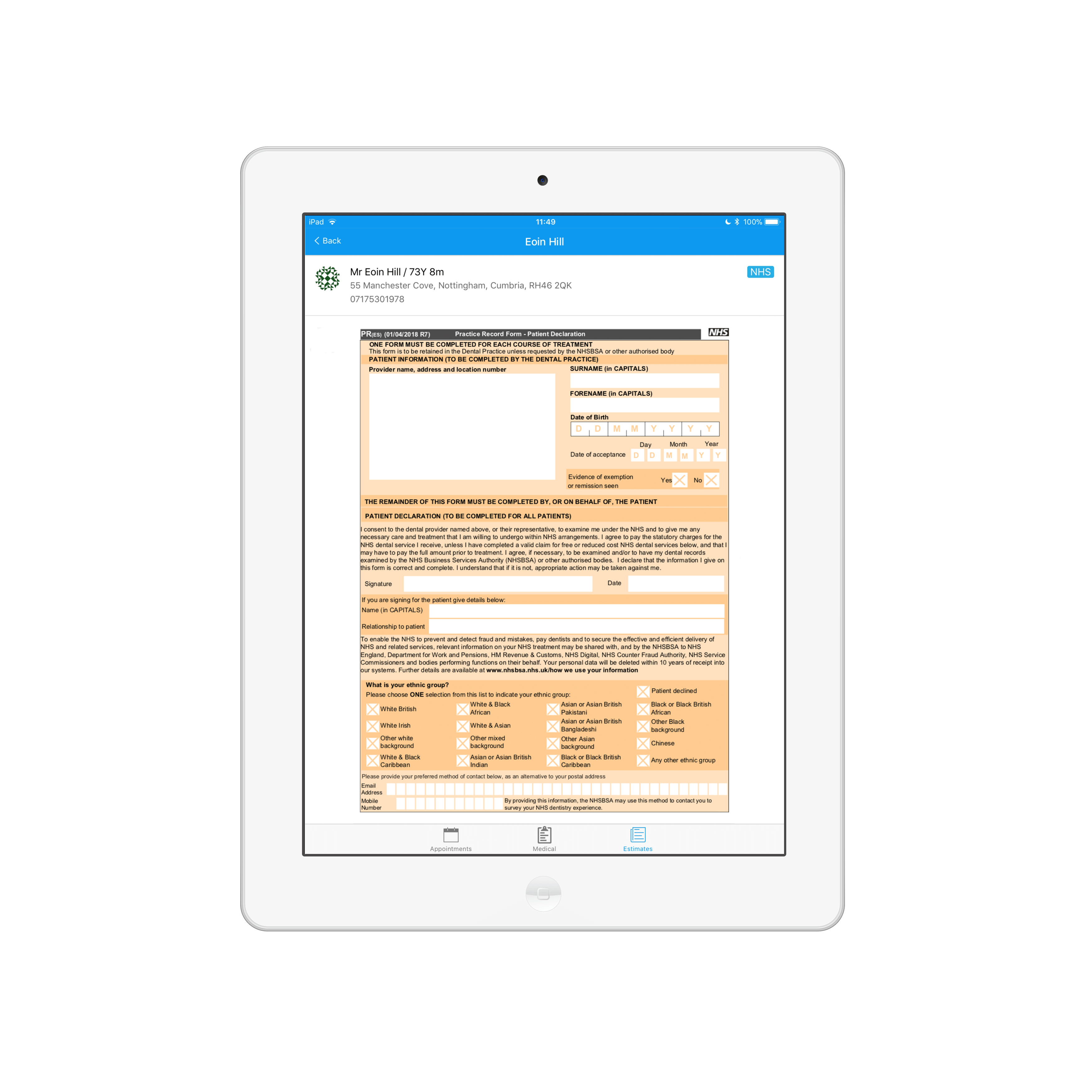 Signed electronically and stored on correspondence tab your estimates, consent forms and medical histories are stored safely helping maintain patient confidentiality and save time - no more wasted practitioner time hunting through paper files to find the most up to date version.